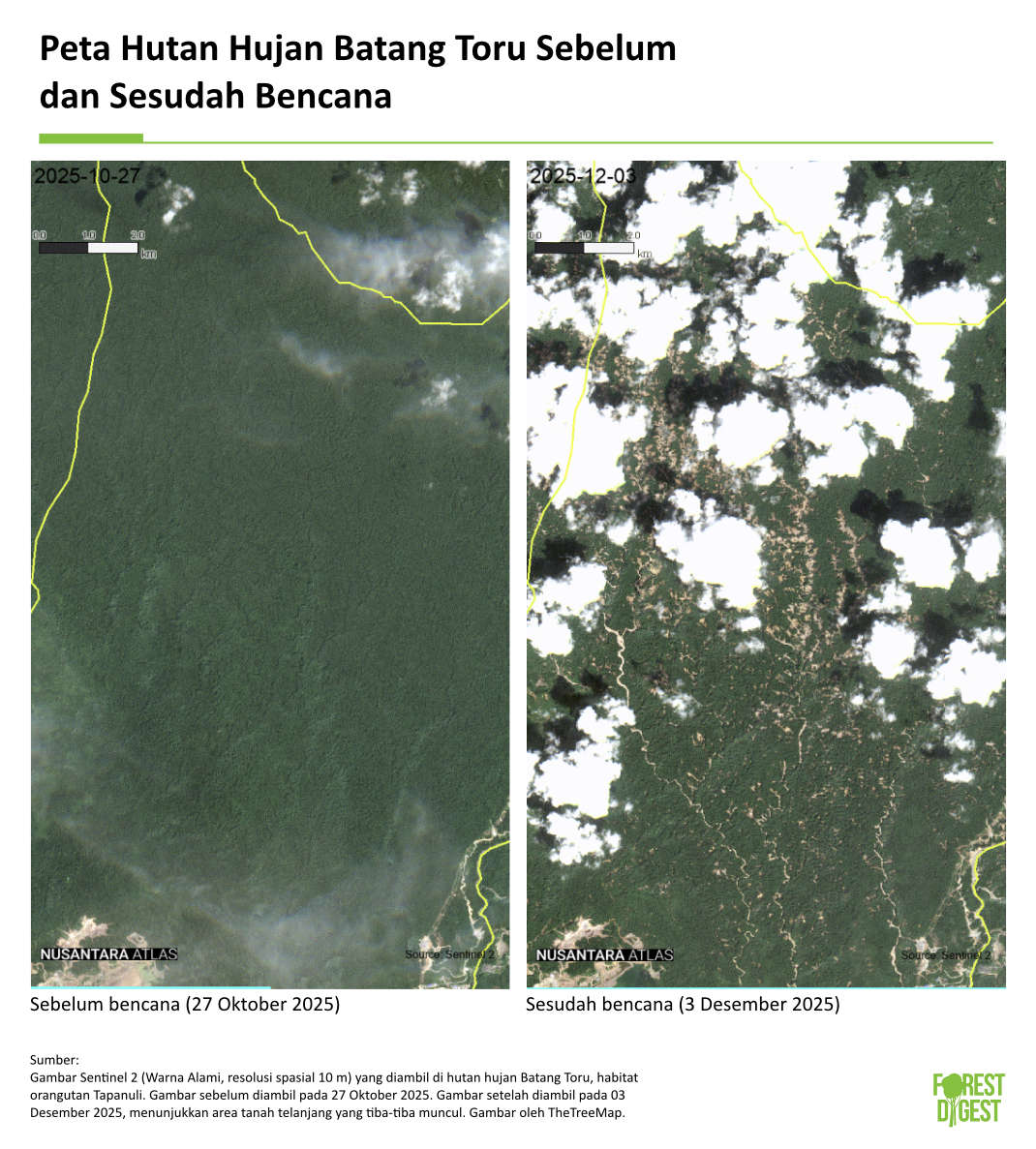 Menggunakan citra satelit Sentinel-2 dan Planet Scope sebelum dan sesudah bencana, para peneliti memetakan kerusakan hutan di Blok Barat Batang Toru, rumah inti orangutan Tapanuli. Hasilnya mencengangkan, 3.964 hektare hutan terkonfirmasi hilang akibat longsor dan sapuan banjir.